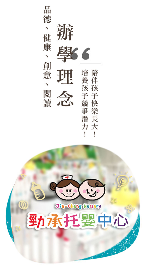 合法專業,全台少數擁有監視系統開放,並擁有醫療團隊進入托嬰中心,為孩子的健康把關。中心建材均通過政府訂之「建築物室內裝修材料耐燃之試驗法」所認定建材防火性能檢驗的標準,均為環保綠能建材耐燃一級防火建材,讓寶貝在安心的托育環境成長。勁承專為0-3歲嬰幼兒設計潛能開發課程,每位寶貝都是獨一無二的,我們依照孩子的發展區分教室,提供個別照護,培養孩子自主快樂學習,讓孩子們擁有安全舒適自在,如同像在家關愛般的環境中成長。